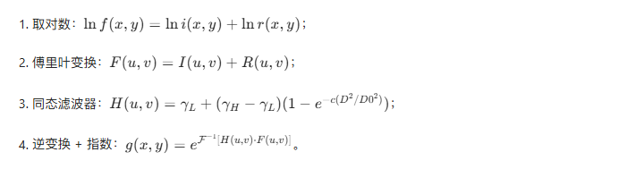 - 同态滤波:适合光照不均匀图像,同时增强暗部细节和抑制亮部过曝。