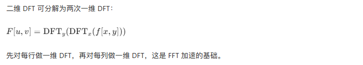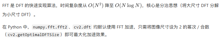 - FFT 大幅提升 DFT 计算效率,工程中需优化图像尺寸以最大化加速效果。