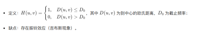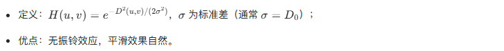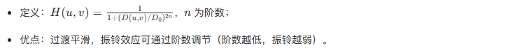 - 低通滤波器实现平滑去噪(理想 LPF 有振铃效应,高斯 / 巴特沃斯更优),高通滤波器实现锐化(高频强调、同态滤波效果更自然);