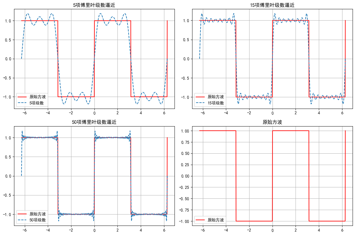 效果说明:项数越多,傅里叶级数越接近原始方波,直观体现了 "不同频率正弦波叠加可逼近周期函数" 的核心思想。
