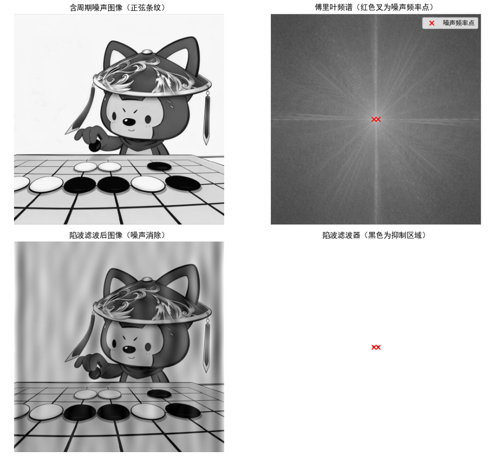 效果说明:陷波滤波器精准抑制周期噪声对应的频率点,有效去除图像中的周期性条纹。