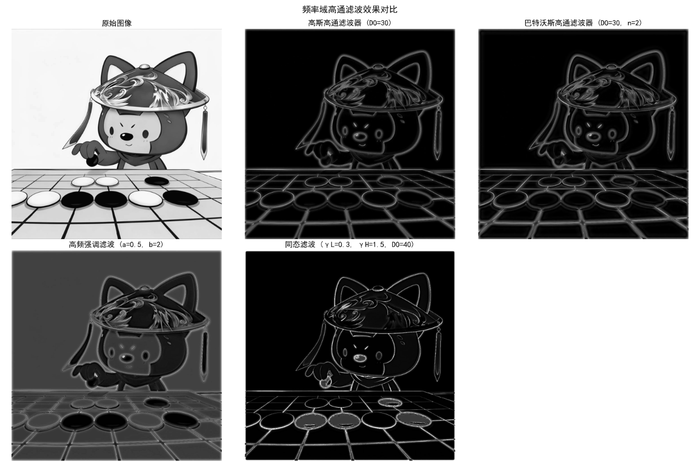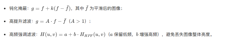 - 高频强调滤波:保留低频(亮度),增强高频(细节),锐化效果更自然;