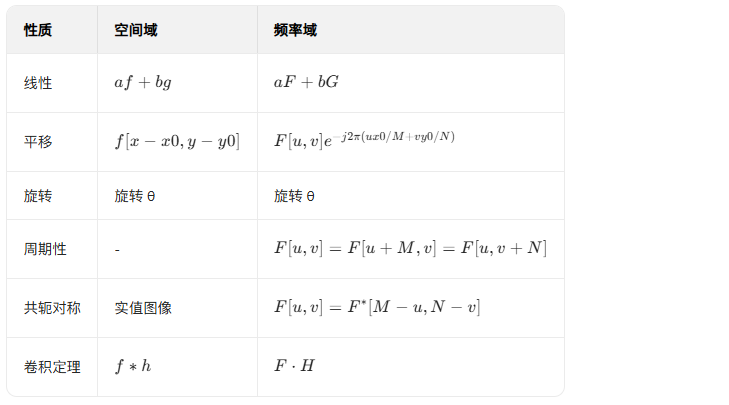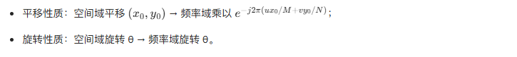 - 二维 DFT 具有平移、旋转、周期性、共轭对称等性质,是滤波器设计的理论依据;