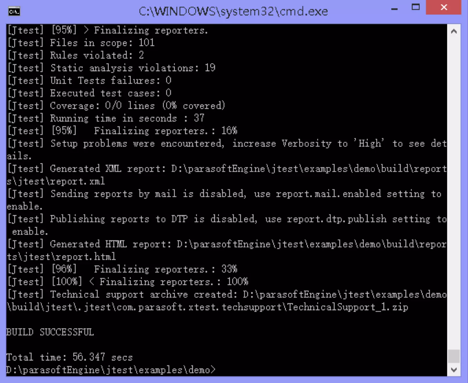 安装好Jtest10.1.2,在安装目录中找内建的项目demo,如: D:\parasoftEngine\jtest\examples\demo。 在命令下cd到该目录,输入gradle compileJava -Djtest.home=d:\parasoftEngin