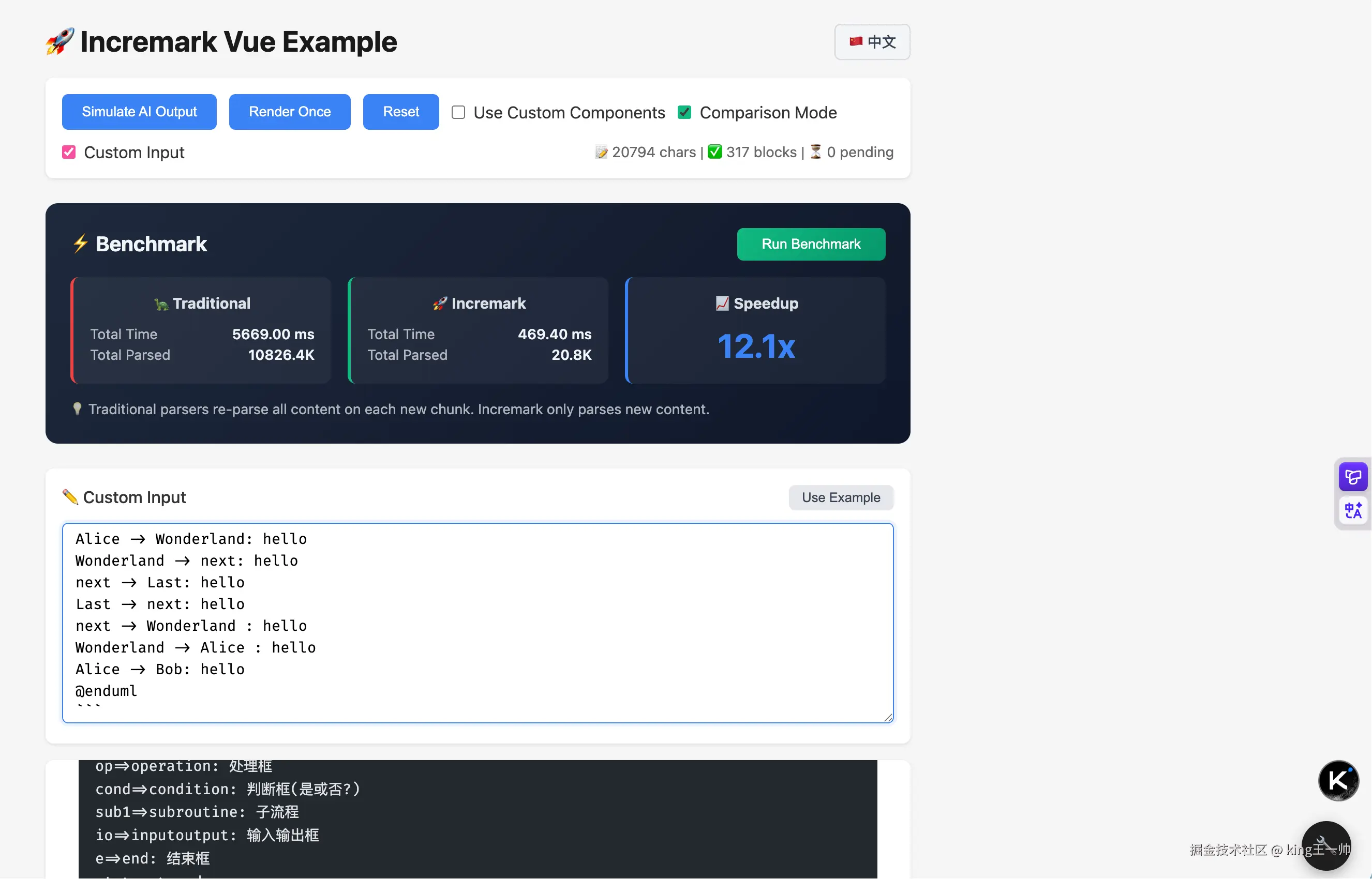 说明:网站每次 benchmark 测试每次提升倍数可能不一样,这是由于分块策略导致的,demo 页面每次分块的 markdown 字符串长度是随机的