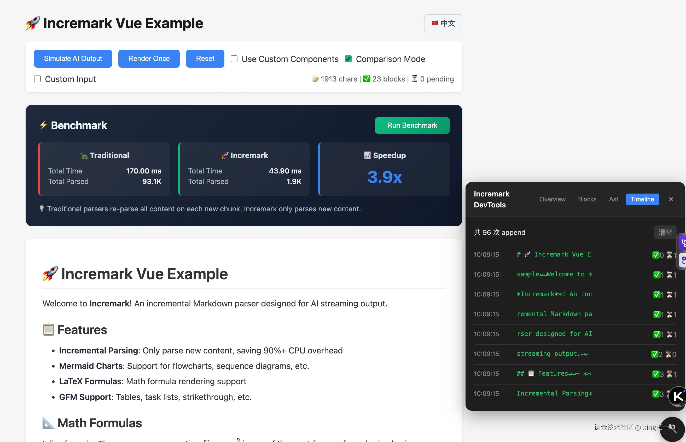 昨天发布了周日开发的 incremark,没想到实际体验性能远超预期,本想作为自己产品内部的一个小工具,但想了想,开源未尝不是一个好的方向。