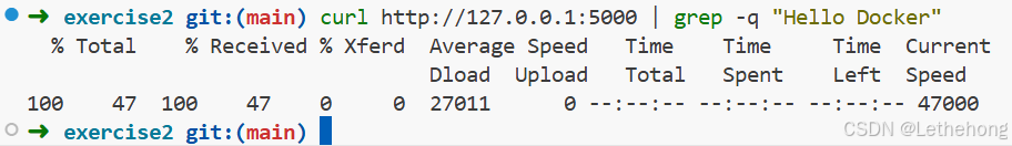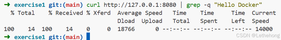 ➜ exercise1 git:(main) curl http://127.0.0.1:8080 | grep -q "Hello Docker"