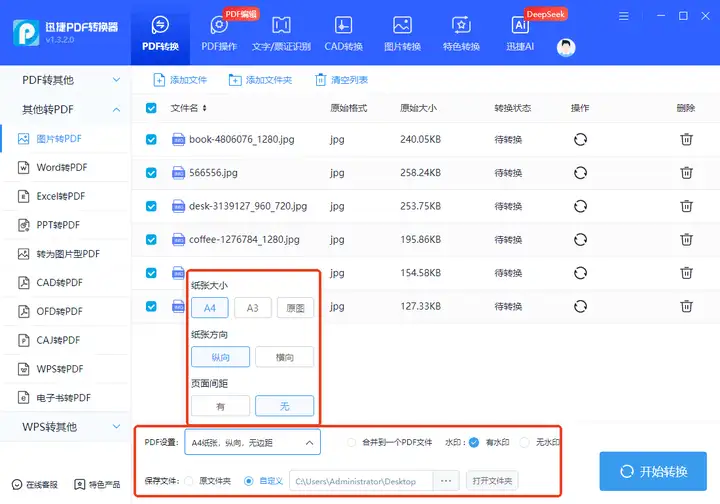 导入图片之后,可以在转换界面中看到它们,接着调整一下输出的PDF纸张大小、页面间距、纸张方向、水印以及是否合并到一个PDF文件等信息,还支持自定义设置输出位置。