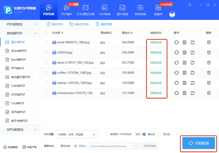 接下来只需要点击右下角的【开始转换】,软件就会在后台对JPG的格式进行调整,稍等一会就能在指定文件夹中找到转换成功的PDF文件了。