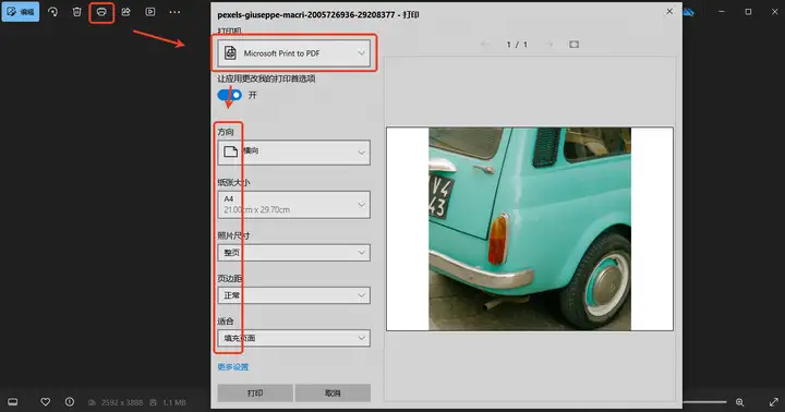 只需要使用照片打开该图片,选择左上角的【打印】,在出现的界面中找到打印机功能,选择「Microsoft Print to PDF」,再设置一下转换参数,点击【打印】,设置保存PDF的位置即可。