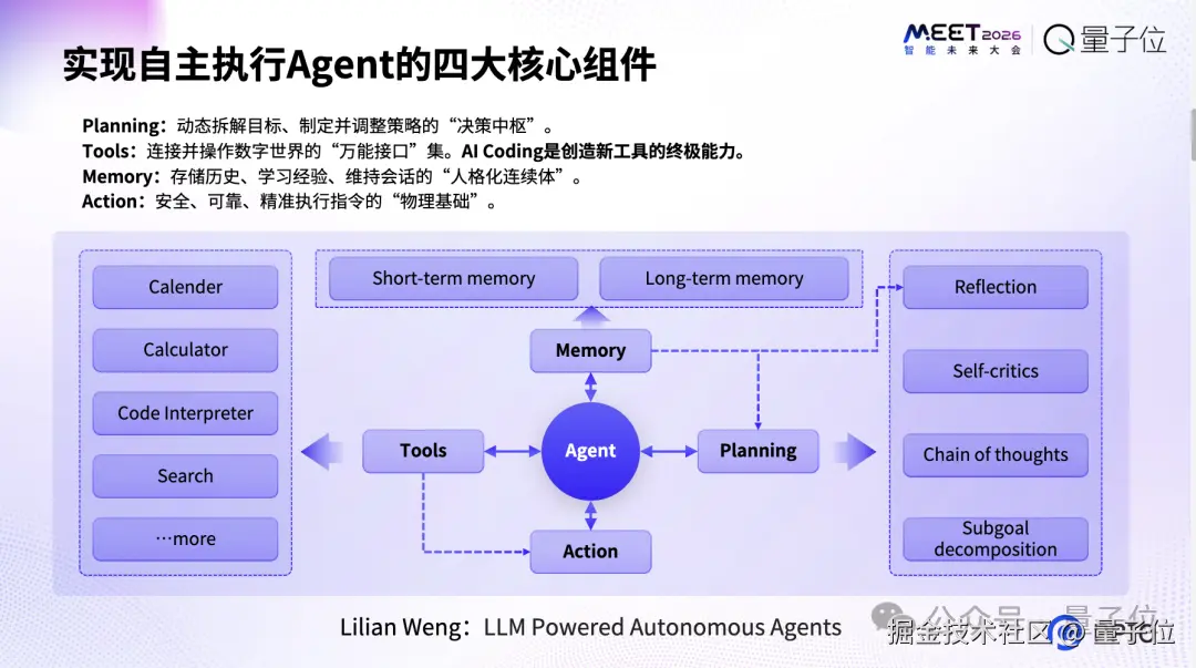 这篇文章里面揭示了真正的智能体有哪些核心的组件,包括四个核心的元素:Memory、Planning、Tools、Action。