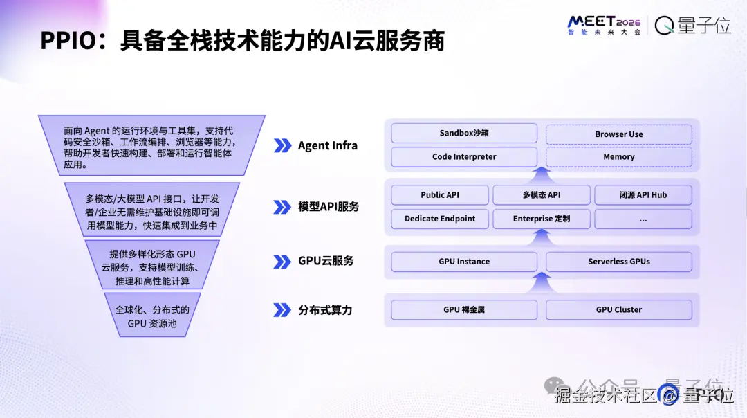 PPIO 是一家 AI 云计算公司,我们从底层算力到 IaaS、PaaS,再到 MaaS,逐层构建了完整的 AI 云能力,为 Agent Infra 提供底座支撑。
