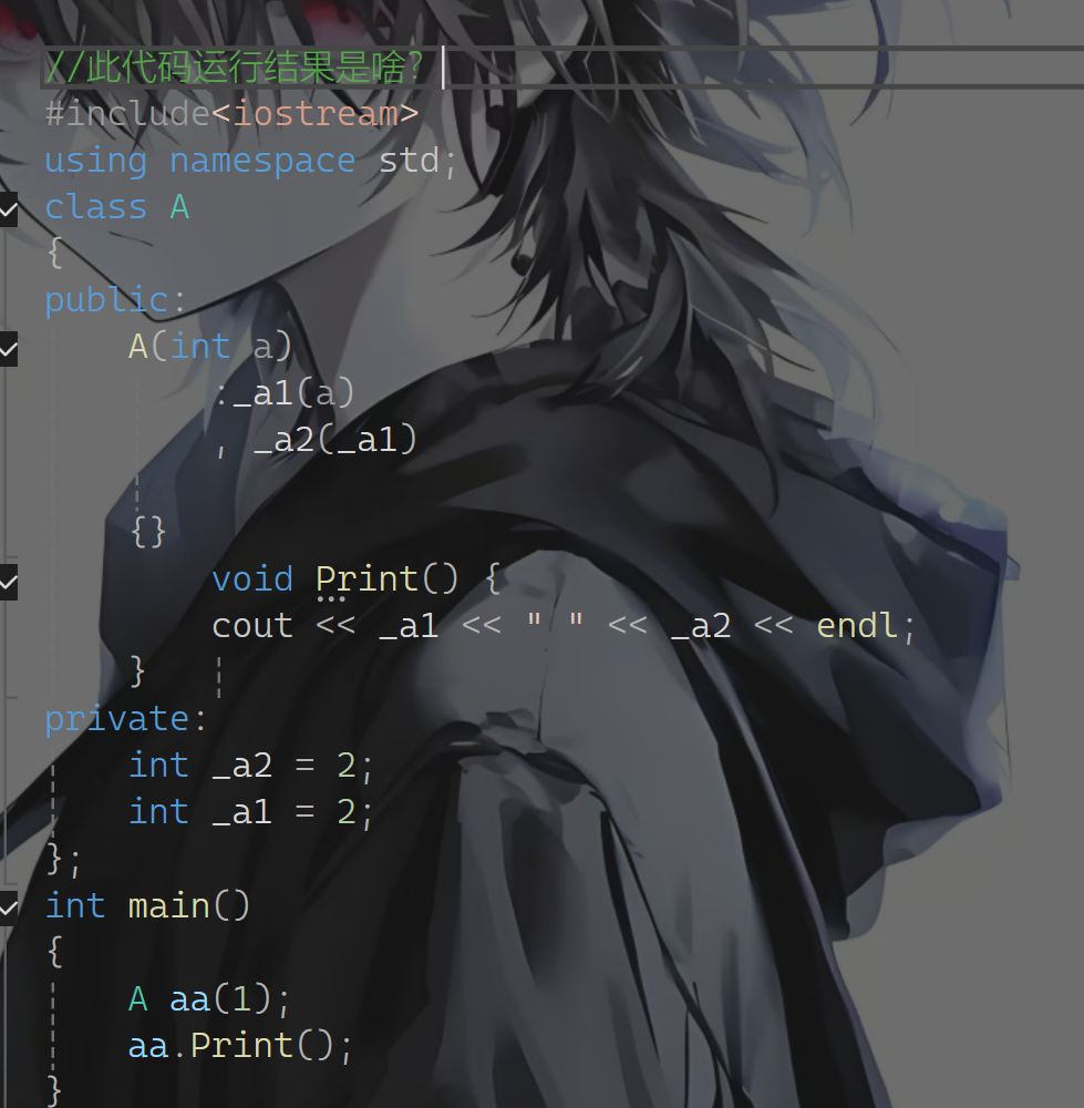 1.成员变量的初始化顺序 = 声明顺序:类中成员变量的初始化顺序,不取决于初始化列表的顺序,而是取决于「在类中声明的顺序」。_a2 先声明,_a1 后声明 → 初始化顺序是 _a2 先,_a1 后。