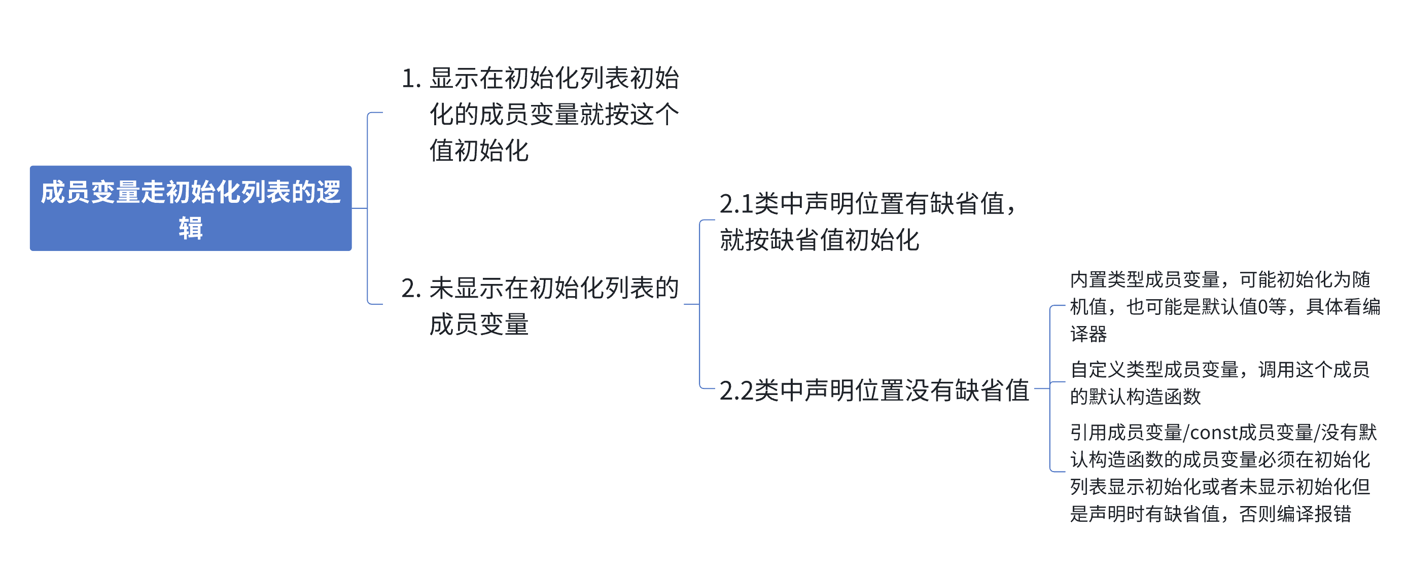 • 尽量使用初始化列表初始化,因为那些你不在初始化列表初始化的成员也会走初始化列表,如果这个成员在声明位置给了缺省值,初始化列表会用这个缺省值初始化。如果你没有给缺省值,对于没有显示在初始化列表初始化的内置类型成员是否初始化取决于编译器,C++并没有规定。对于没有显示在初始化列表初始化的自定义类型成员会调用这个成员类型的默认构造函数,如果没有默认构造会编译错误。