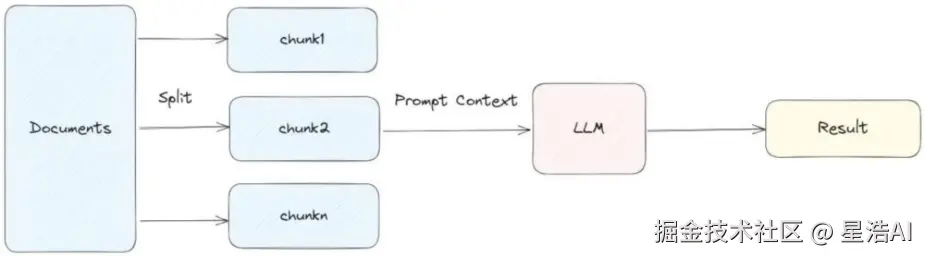 将所有检索到的文档片段直接拼接成一个长上下文,与问题一起构造 Prompt,单次调用 LLM 生成答案。