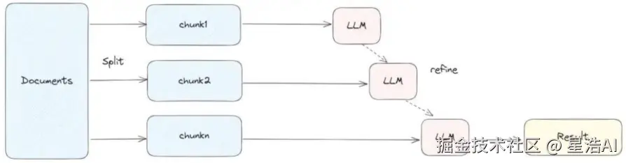 先用第一个文档和问题生成初步答案;依次将后续文档与当前答案合并,逐步"细化"输出,每次更新答案。
