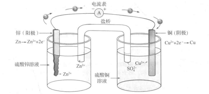 电解质:硫酸铜和硫酸锌溶液,阻断了电子直接传递。硫酸铜和硫酸锌溶液被隔开,并用盐桥连接。