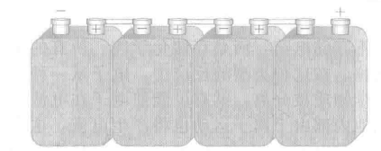 为了增加电池电压,如果一个电池单元的正极与另一个电池单元的负极相连接,以此类推,电池总电压就是单个电池电压的总和,称为 电池的串联。如下图所示