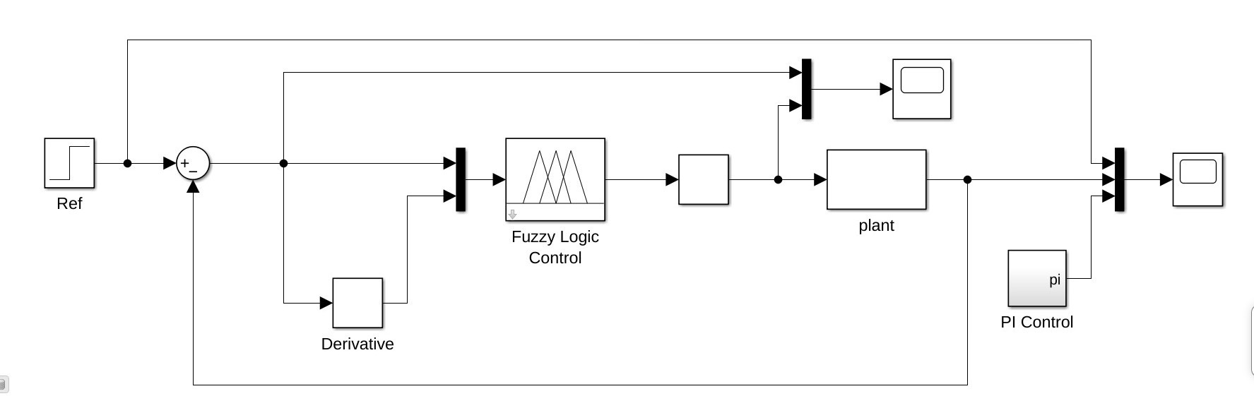 motorFLC.fis文件),其输出连接到一个Gain模块进行适当缩放,再连接到电机模型模块。电机模型模块输出的转速反馈到Compare模块形成闭环。同时,使用Scope模块连接到关键信号节点用于波形记录。