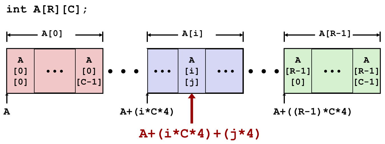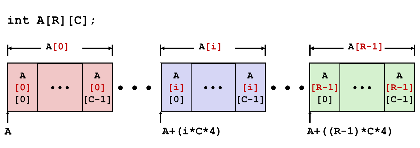 A[i]表示第 i 行,是一个包含 C 个 T 类型元素的数组。- 起始地址计算公式:
