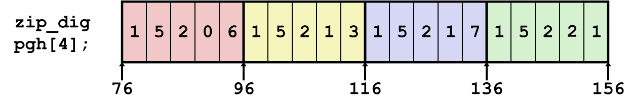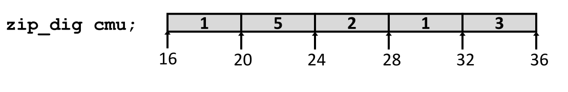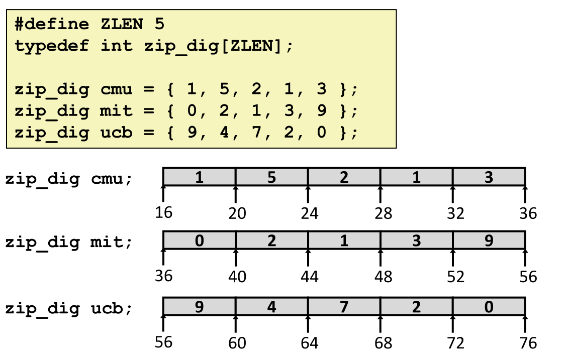 typedef int zip_dig[ZLEN]等价于int cmu[5]。 cmu = {1,5,2,1,3}分配在 20 字节块。mit = {0,2,1,3,9}和ucb = {9,4,7,2,0}连续分配。