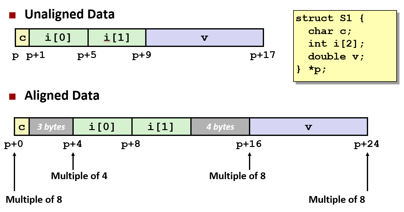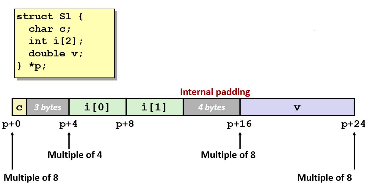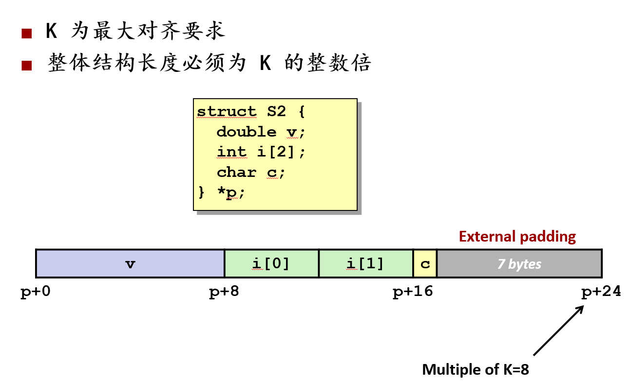 - 成员顺序:double v(8B)、int i[2](8B)、char c(1B),K = 8,因此整体长度需为 8 的倍数。