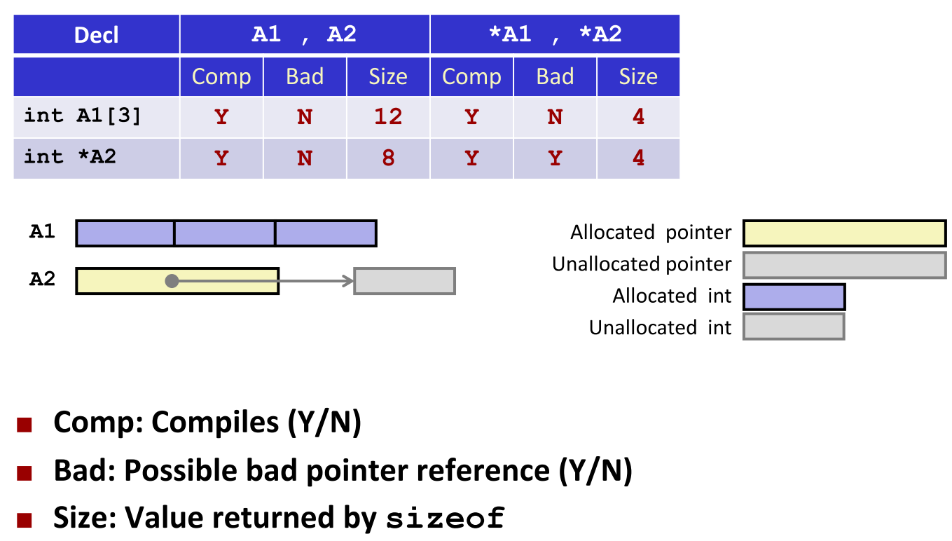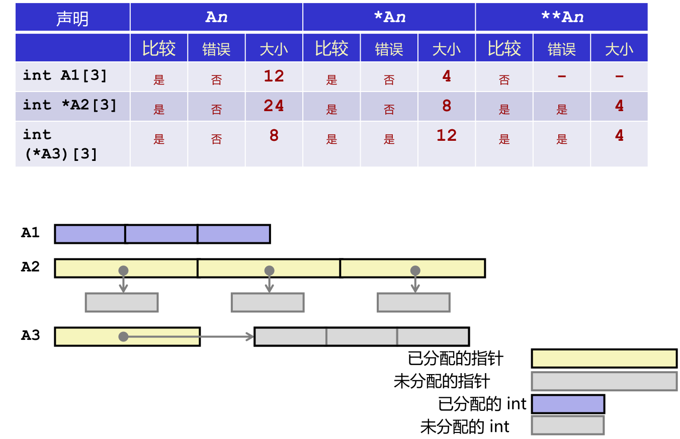 An(A2):大小 24(3×8 字节),合法*An(*A2):返回第一个指针,大小 8,合法**An(**A2):解引用得 int,大小 4,但存在非法访问风险