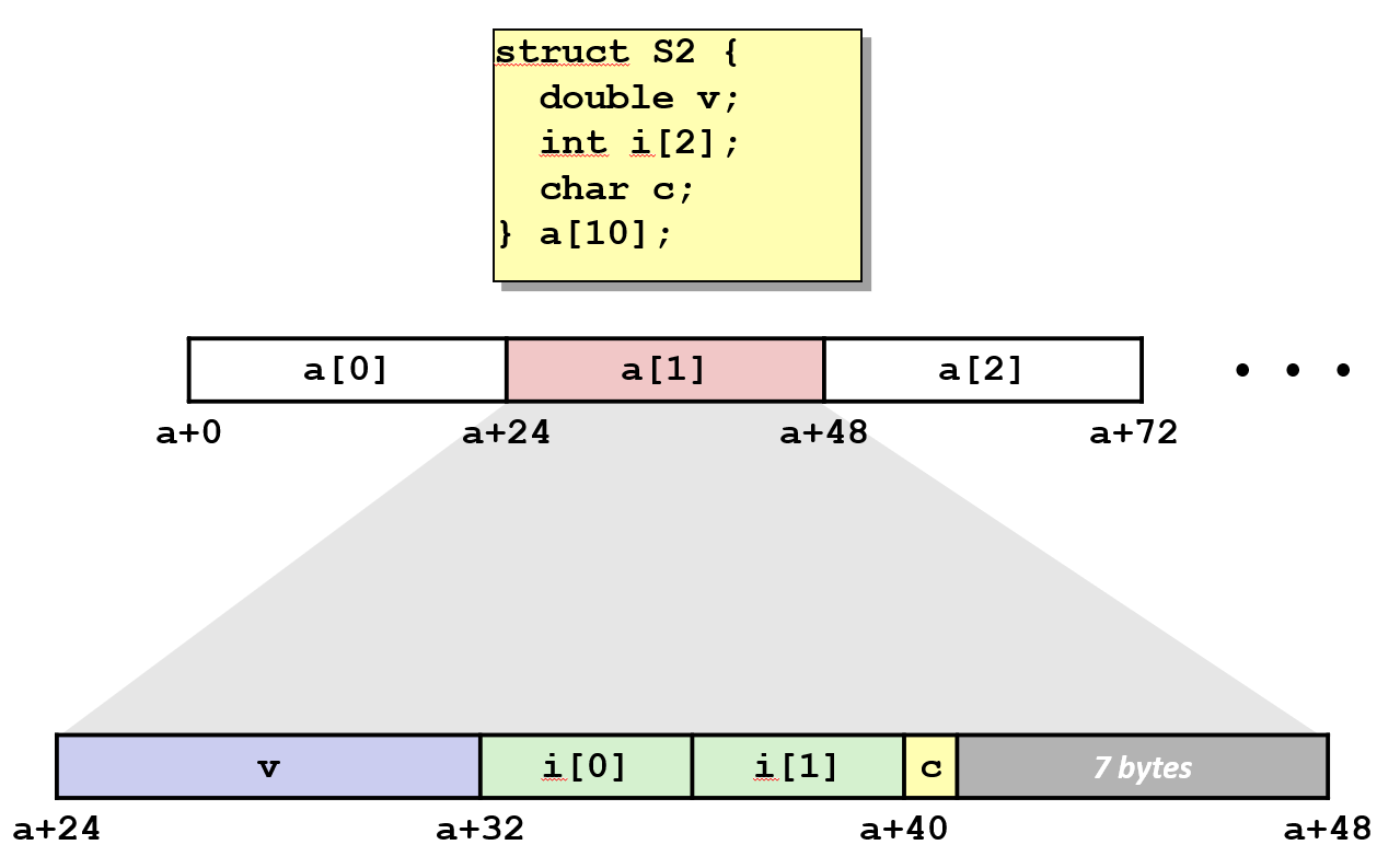 - 每个结构体实例起始地址均为单个结构体的倍数。数组连续存放,步长等于对齐后结构体大小(如 24 字节)。