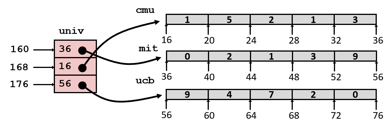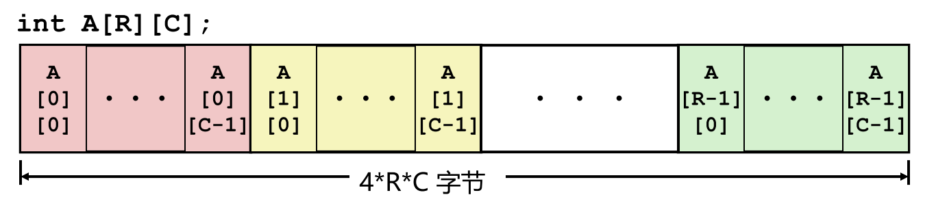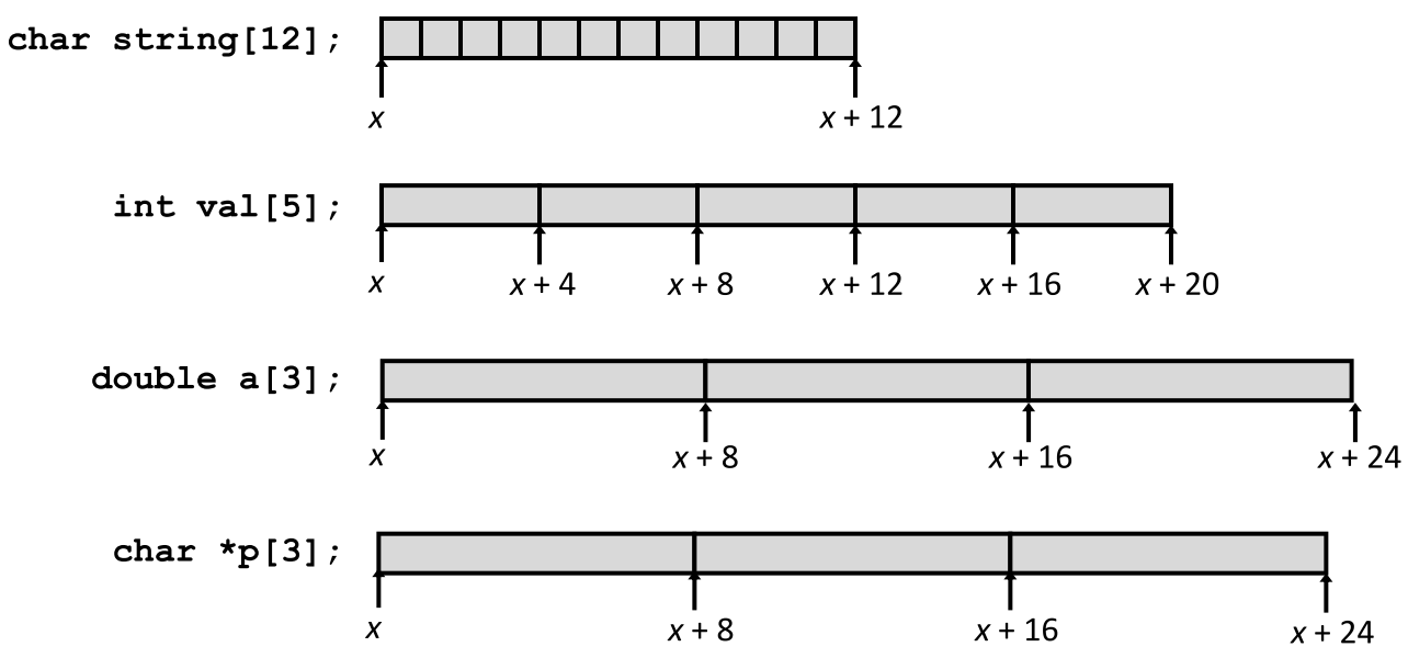 T A[L],表示类型为 T、长度为 L 的数组,在内存中连续分配L * sizeof(T)字节的区域。char string[12]:分配 12 字节int val[5]:分配 20 字节(每个 int 占 4 字节)double a[3]:分配 24 字节(每个 double 占 8 字节)char *p[3]:分配 24 字节(每个指针占 8 字节)