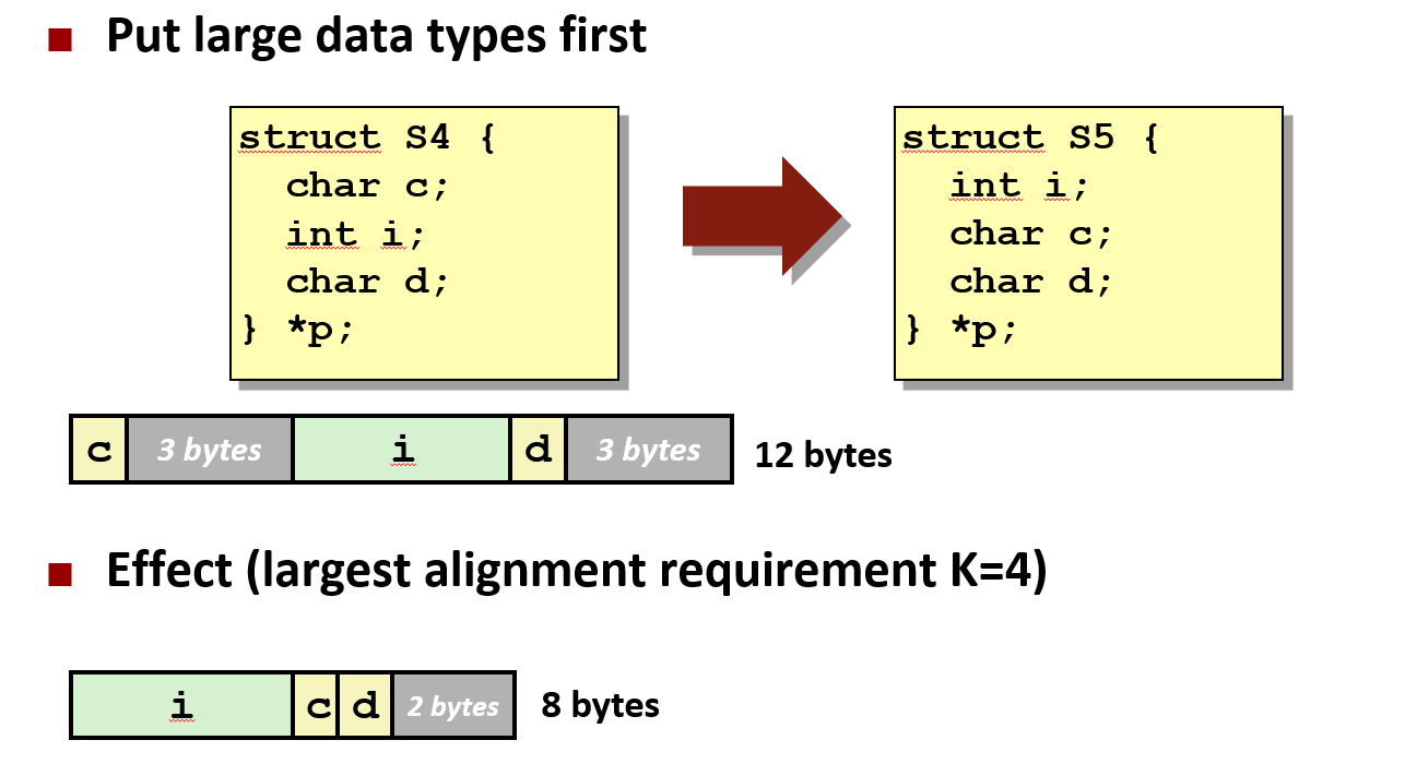 - 在 char c 后添加 3 字节填充,使 int i[2] 对齐到 4 字节边界