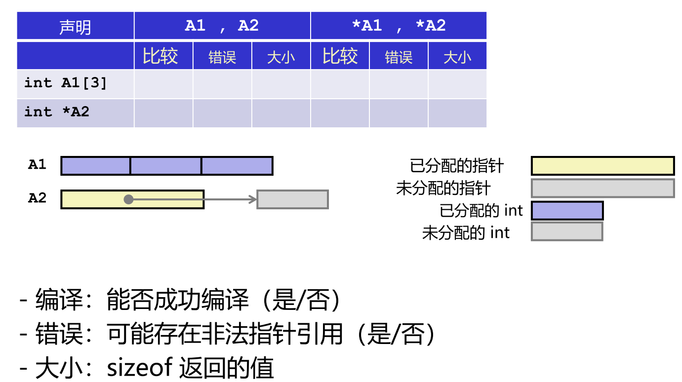 A1:编译成功(是),无非法引用风险(否),sizeof(A1)返回 12(3×4 字节)。*A1:编译成功(是),合法访问首元素(否),sizeof(*A1)返回 4(一个 int 大小)。A2:编译成功(是),无非法引用风险(否),但未初始化,sizeof(A2)返回 8(指针大小)。*A2:编译成功(是),存在非法引用风险(是),因指向未分配内存,sizeof(*A2)返回 4。
