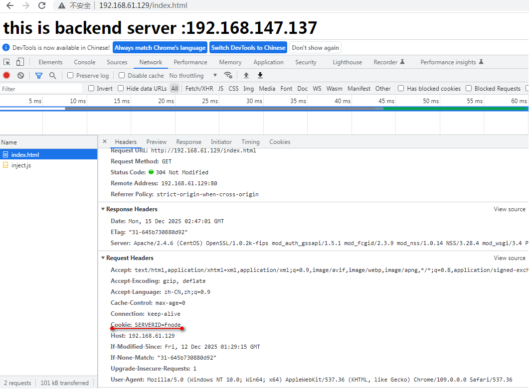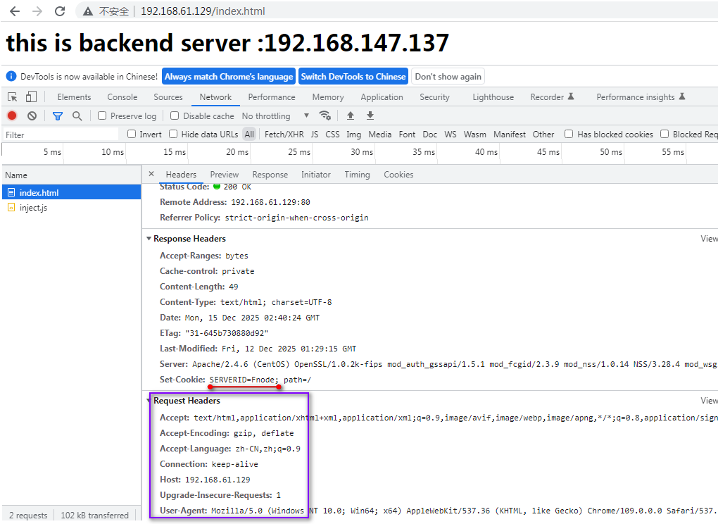可以看到response报文首部cookie中设置了SERVERID这个cookie,其值为Fnode,此后,客户端的请求报文中会携带这个cookie值, 所有带有此cookie的请求被转发至node节点服务器上,实现会话级绑定。