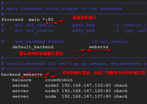 frontend:前端,接收客户端请求,即配置监听在某个端口上,还要配置转发至后端的backend,