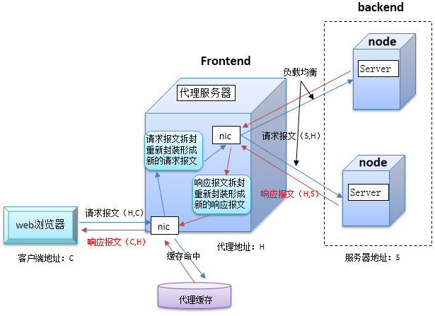 反向代理,接受客户端的请求报文,将请求拆封后,构建新的请求报文,以代理主机的名义向后端服务器发起请求,在接到服务器的响应报文后,将响应报文拆封后重新封装成新的响应报文,返回给客户端。在接收请求报文拆封重新封装时,以及接收到响应报文拆封重新封装响应报文时,代理服务器都可以做一些特定的操作。对于后端服务器,他所看到的请求报文的源地址都是代理服务器的地址,而不是真正的客户端地址。同样在客户端看来,其获得的响应报文的服务器地址是代理服务器的地址,而不是真正的后端服务器地址。这些过程对理解和设置日志很重要。