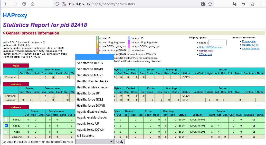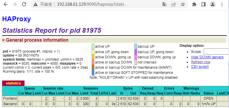 此时的状态页只是查看功能,在配置中增加stats admin语句,启动管理功能: