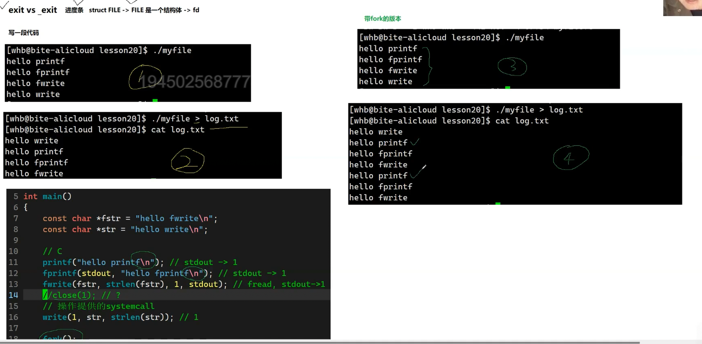 cpp#include <stdio.h> #include <string.h> #include <unistd.h> int main() { //printf("hello Linux"); //close(1); //return 0; const char *fstr = "hello fwrite\n"; const char *str = "hello write\n"; // C printf("hello printf\n"); // stdout -> 1 sleep(2); fprintf(stdout, "hello fprintf\n"); // stdout -> 1 sleep(2); fwrite(fstr, strlen(fstr), 1, stdout); // fread, stdout->1 sleep(2); // 操作提供的systemcall write(1, str, strlen(str)); // 1 sleep(5); //close(1); // ? fork(); return 0; }