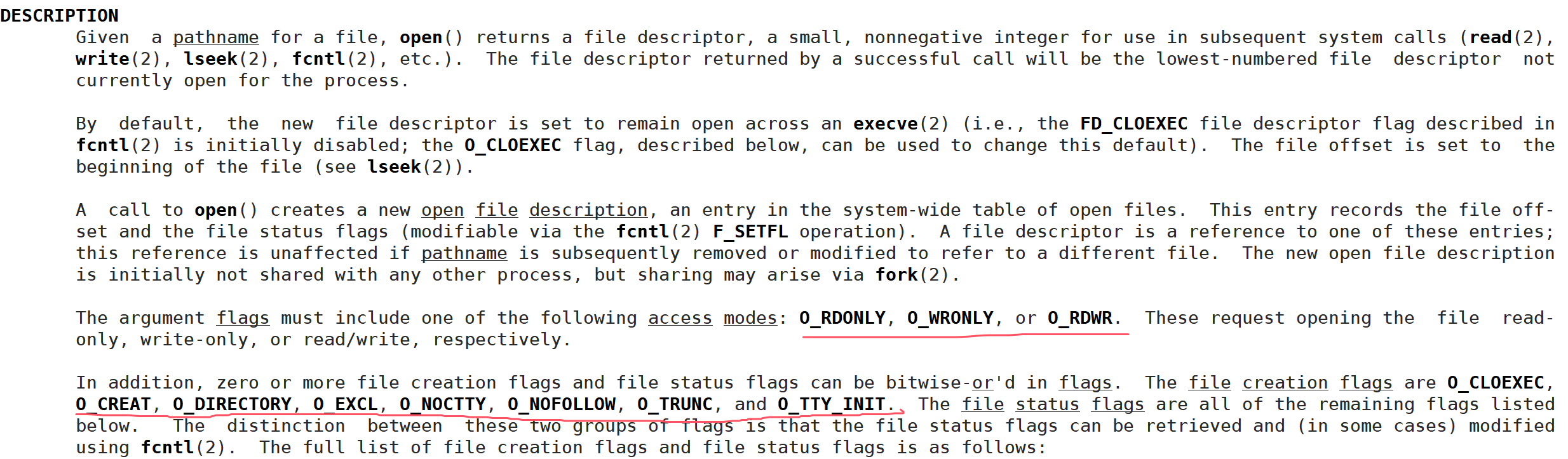 cpp#include <sys/types.h> #include<sys/stat.h> #include<fcntl.h> int open(const char *pathname,int flags); int open(const char *pathname,int flags,mode_t mode); pathname:要打开或创建的目标文件 flags:打开文件时,可以传入多个参数选项,用下面的一个或者多个常量进行"或"运算,构成flags。 参数: O_RDONLY:只读打开 0_WRONLY:只写打开 O_RDWR:读,写打开 这三个常量,必须指定一个且只能指定一个 oCREAT:若文件不存在,则创建它。需要使用mode选项,来指明新文件的访问权限 O_APPEND:追加写 返回值: 成功:新打开的文件描述符 失败:-1open 函数具体使用哪个,和具体应用场景相关,如目标文件不存在,需要open创建,