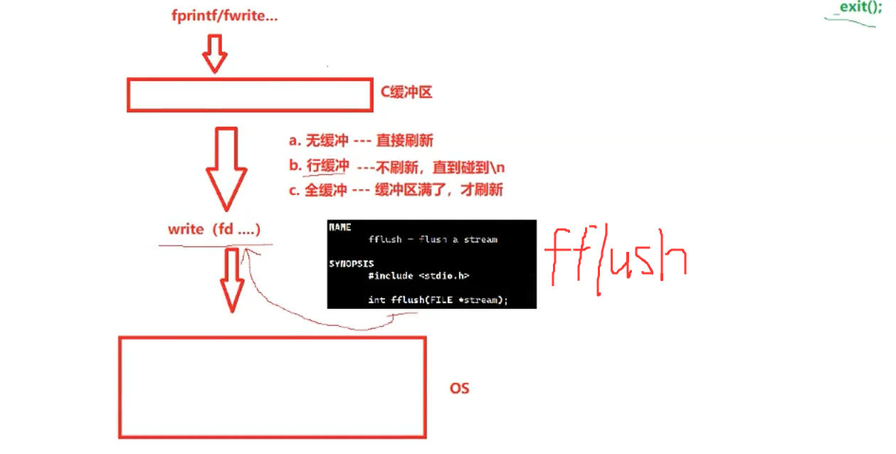 所以exit() 和 _exit()我们就可以深刻理解他们两个之间的区别了,_exit()看不到c语言提供的缓冲区