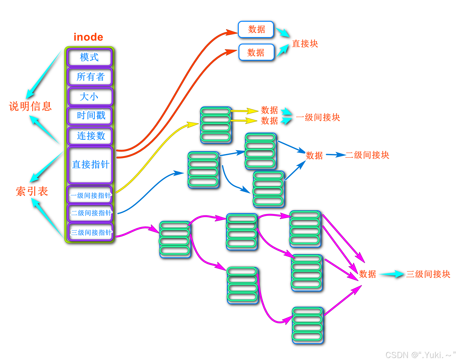 直接索引:i_block[0]到i_block[11](共 12 个),直接存储数据块编号。一级间接索引:i_block[12],存储的是 "间接块" 的编号(该块中存放的是数据块编号列表)。