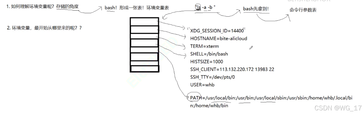 举个例子,比如说"ls -a -b",登录,bash先根据系统配置文件生成环境变量表,后用户输入命令行参数,生成命令行变量表, 后拿ls在PATH里面找是否存在,存在,执行,不存在就找不到
