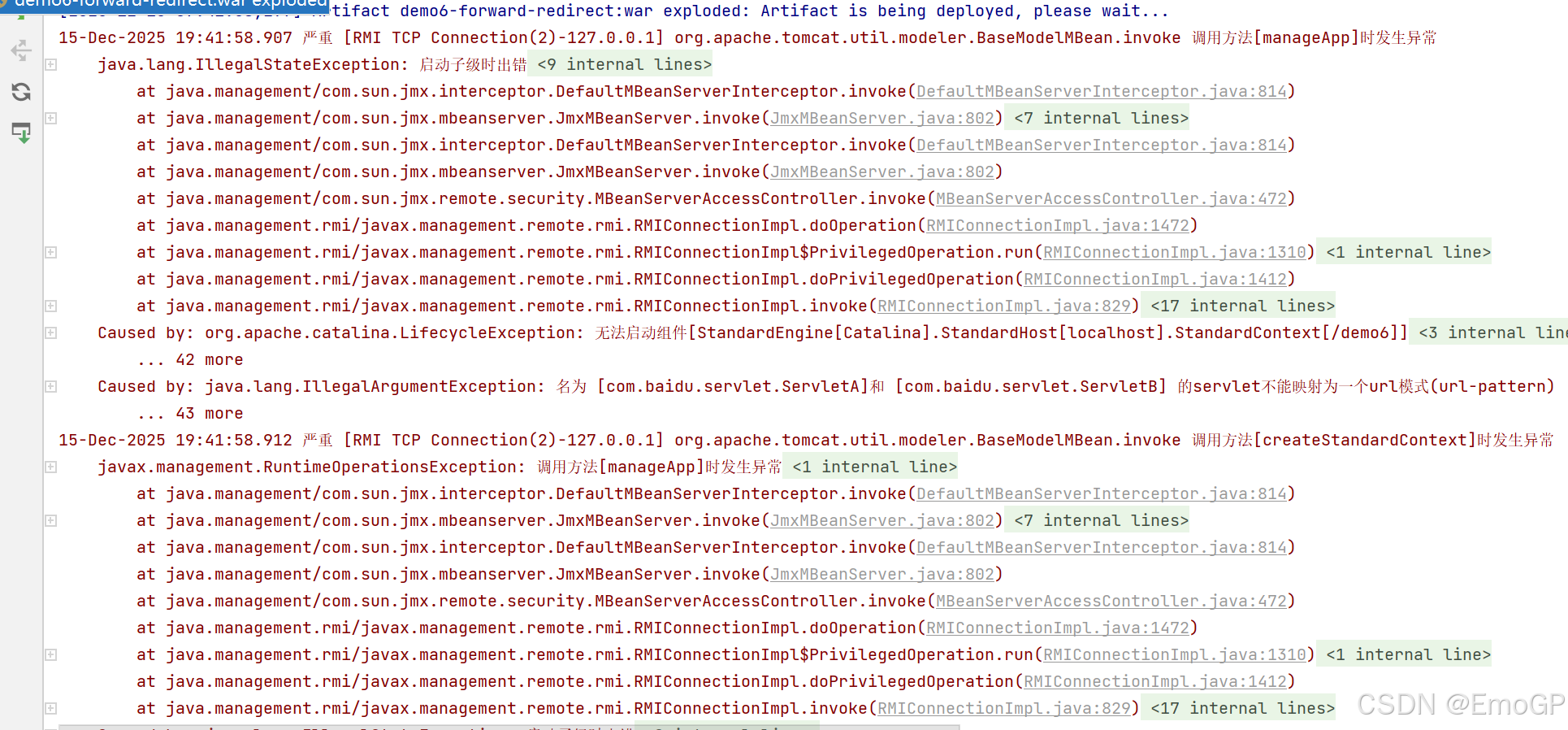 Tomcat 启动时会扫描所有 @WebServlet 注解的 Servlet,发现同一个 URL 路径(/servletA)被多个 Servlet 绑定,导致容器无法解析映射规则,最终抛出 "启动子级时出错" 的顶层异常。