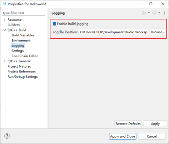 2)、在属性窗口中,展开"C/ c++ Build",选择"Logging"。在Logging中可以看到有一个Enable build logging的选项,勾选上就会在Build后会自动生成build log文件。在下面还可以指定log文件的存储路径(如图2)。