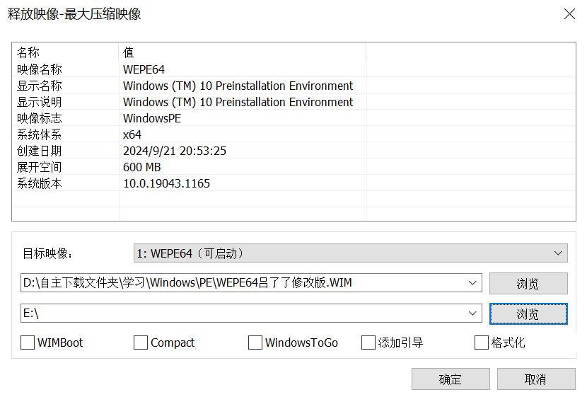 \WEPE->WEPE64.WIM) - 释放时,下面的5个选项(wimboot,compact,Windows to go,添加引导,格式化)一律不勾选