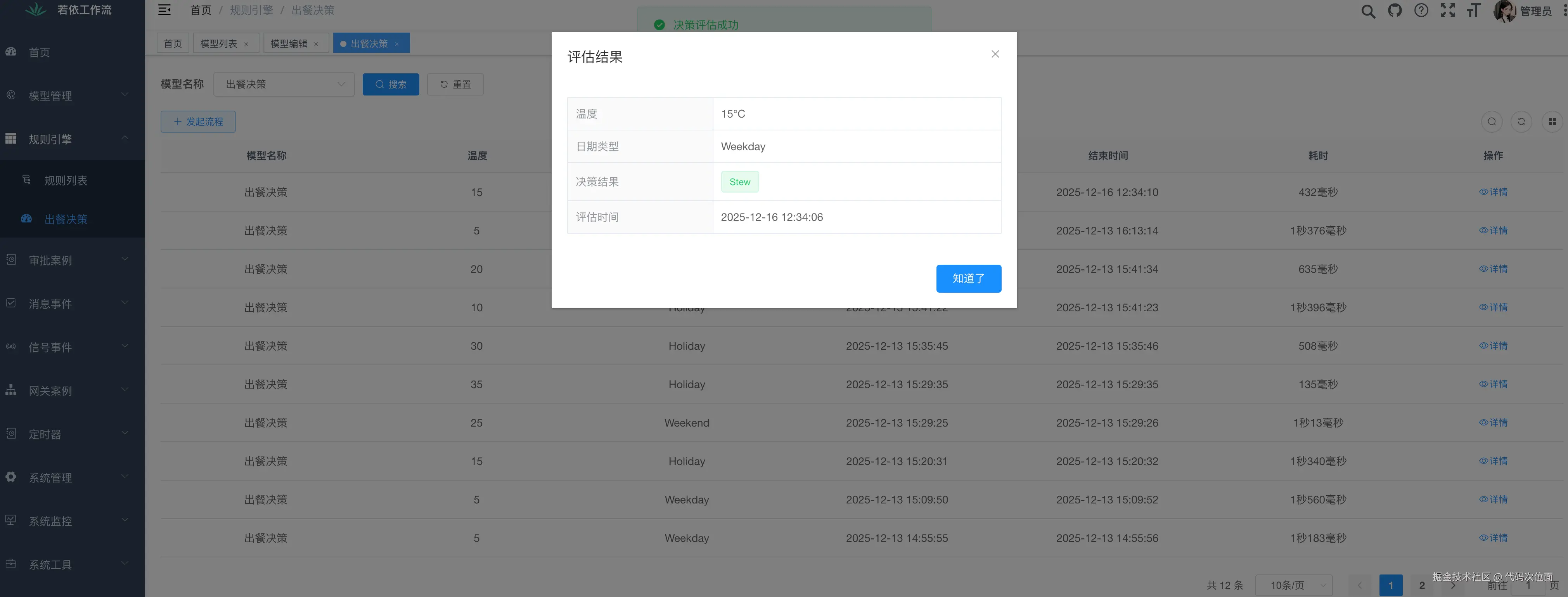 这个Dish决策表规则是根据当前的气温(tempeature)和日期类型(dayType)决策上什么餐食。主要有三个决策表构成, 核心是Dish-Decision表。