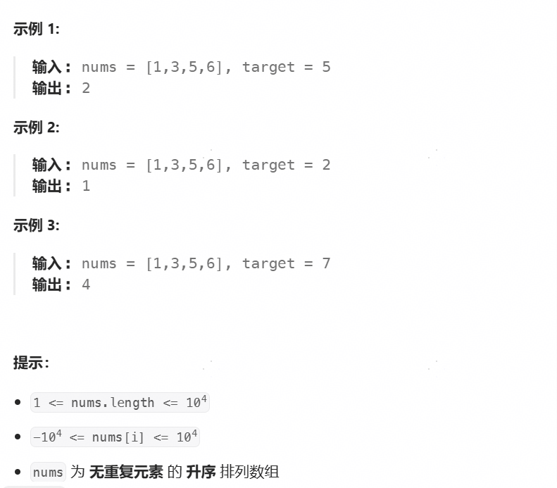 1.二分法的思路,注意最后返回的是left,分析原因,此时left > right才会跳出循环,第一种情况left = temp+1之后导致的跳出循环,target大于left和right所在的位置的值,往后移一位便是插入的位置。第二种情况,right = temp - 1导致的,target小于left和right所在的位置,返回之前的right所在的位置,也就是left。