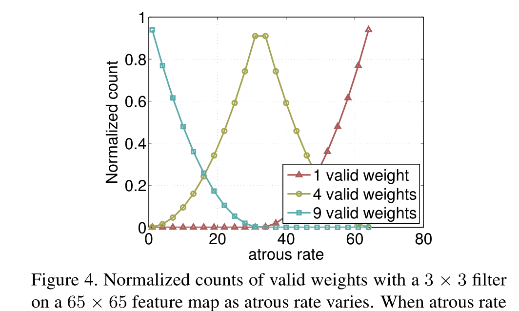 采用不同空洞率的 ASPP 能够有效地捕捉多尺度信息。然而,我们发现,随着采样率的增大,有效滤波器权重的数量(即应用于有效特征区域而非填充零值的权重)会减少 。这一现象在图 4 中得到了体现,当对一个 65×65 的特征图应用 3×3 的滤波器时,采用了不同的空洞率。在极端情况下,当空洞率值接近特征图的大小时,3×3 的滤波器不再能够捕捉整个图像上下文,而是退化为一个简单的 1×1 的滤波器,因为只有中心滤波器的权重是有效的。