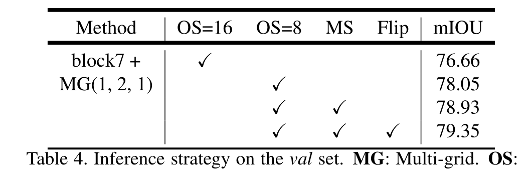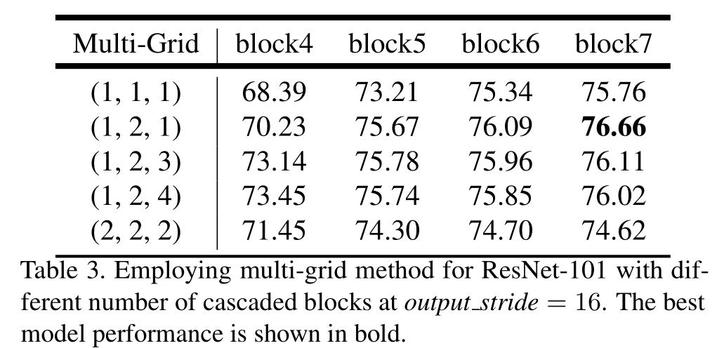 受多网格方法的启发,该方法采用了不同大小网格的层级结构[4, 81, 5, 67],并遵循[84, 18]的相关规定,我们在所提出的模型中在块4到块7之间采用了不同的空洞率。特别地,我们定义 Multi Grid = (r1, r2, r3) 为块4到块7内三个卷积层的单位空洞率。卷积层的最终空洞率等于单位空洞率与相应空洞率的乘积。例如,当输出步长为16 且 Multi Grid = (1, 2, 4) 时,三个卷积层在块4 中的空洞率分别为 = 2 · (1, 2, 4) = (2, 4, 8) 。
