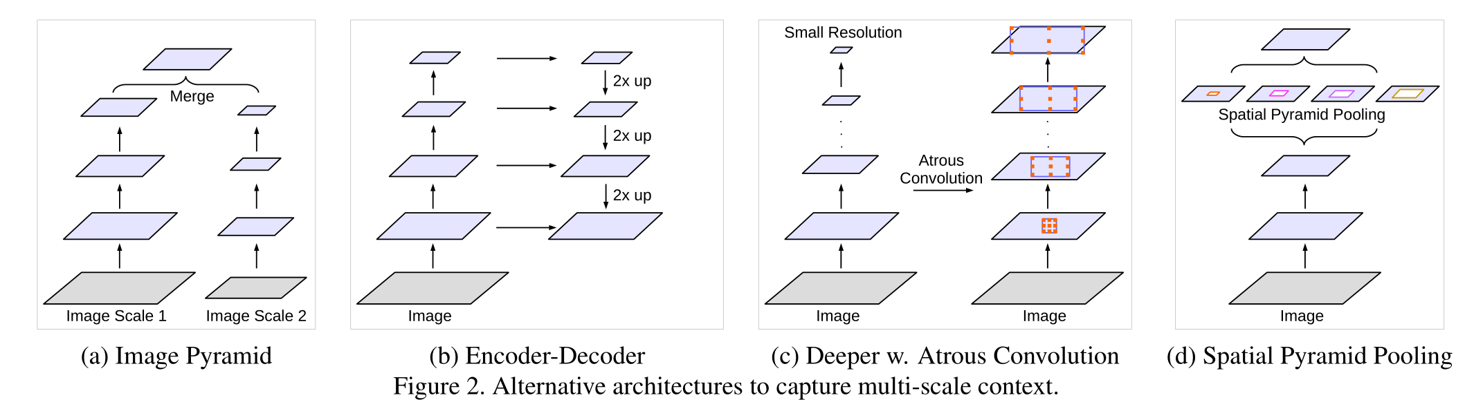 另一个难题源于存在多种尺度的物体。已有多种方法来解决这一问题,在本研究中,我们主要考虑了以下四个类别,如图 2 所示。首先,将深度卷积神经网络应用于图像金字塔,为每个尺度输入提取特征[22, 19, 69, 55, 12, 11],其中不同尺度的物体在不同的特征图中变得突出。其次,编码器-解码器结构[3, 71, 25, 54, 70, 68, 39]利用编码器部分的多尺度特征,并从解码器部分恢复空间分辨率。第三,在原始网络之上添加额外的模块以捕捉长距离信息。特别地,DenseCRF [45]用于编码像素级别的成对相似性[10, 96, 55, 73],而[59, 90]则在级联中开发了几层额外的卷积层,以逐步捕捉长距离上下文。第四,空间金字塔池化[11, 95]使用滤波器或池化操作以不同速率和多个有效视场对输入特征图进行处理,从而捕获不同尺度的物体。