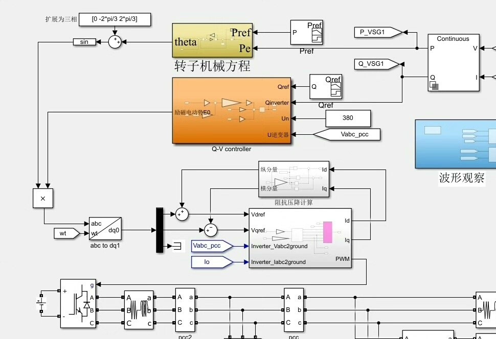 有功无功外环控制决定了VSG与外部电网(这里是离网状态下的等效负载等)之间的功率交换。通过调节有功无功,可以使VSG适应不同的负载需求。