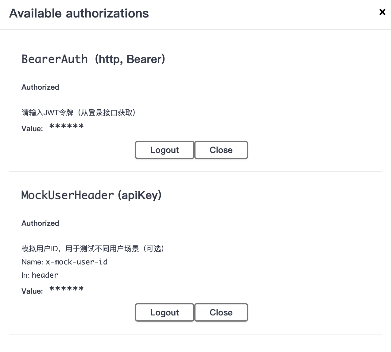配置项处理 成功 失败 是 否 是 否 是 否 是 否 BearerAuth有值? MockUserHeader有值? RequestIdHeader有值? 其他Header有值? 设置Authorization头 跳过 设置x-mock-user-id头 跳过 设置用户提供的request-id 自动生成request-id 设置对应Header 跳过 用户点击Execute Swagger UI准备请求 触发requestInterceptor 读取LocalStorage 获取authorized数据 JSON.parse解析 使用空配置 请求头组装 发送增强后的HTTP请求